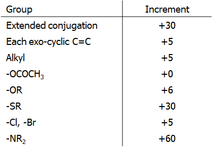 - Woodward-Fieser Rules - DienesThe rules begin with a base value for lmax of the chromophore being observed:The incremental contribution of substituents is added to this base value from the group tables:For example: