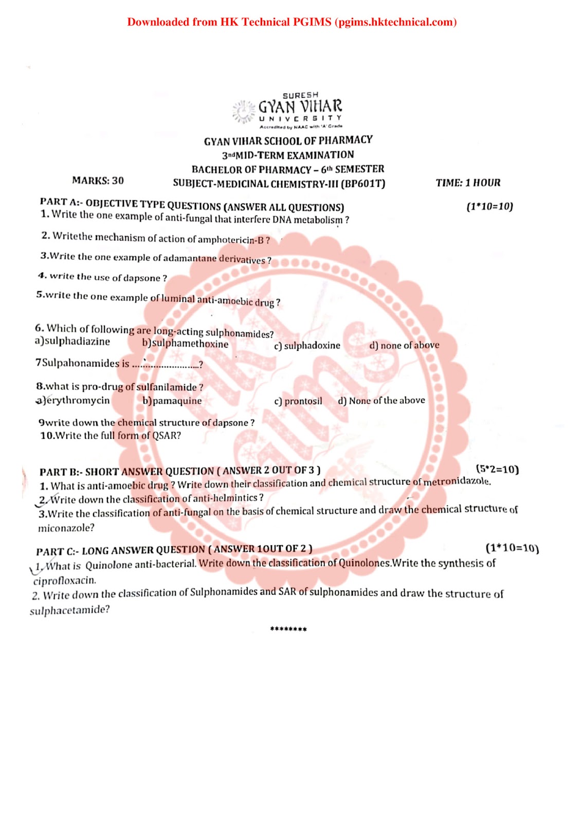 Medicinal Chemistry-III SGV University Download Question Paper PDF BPharmacy 6th Semester 2022