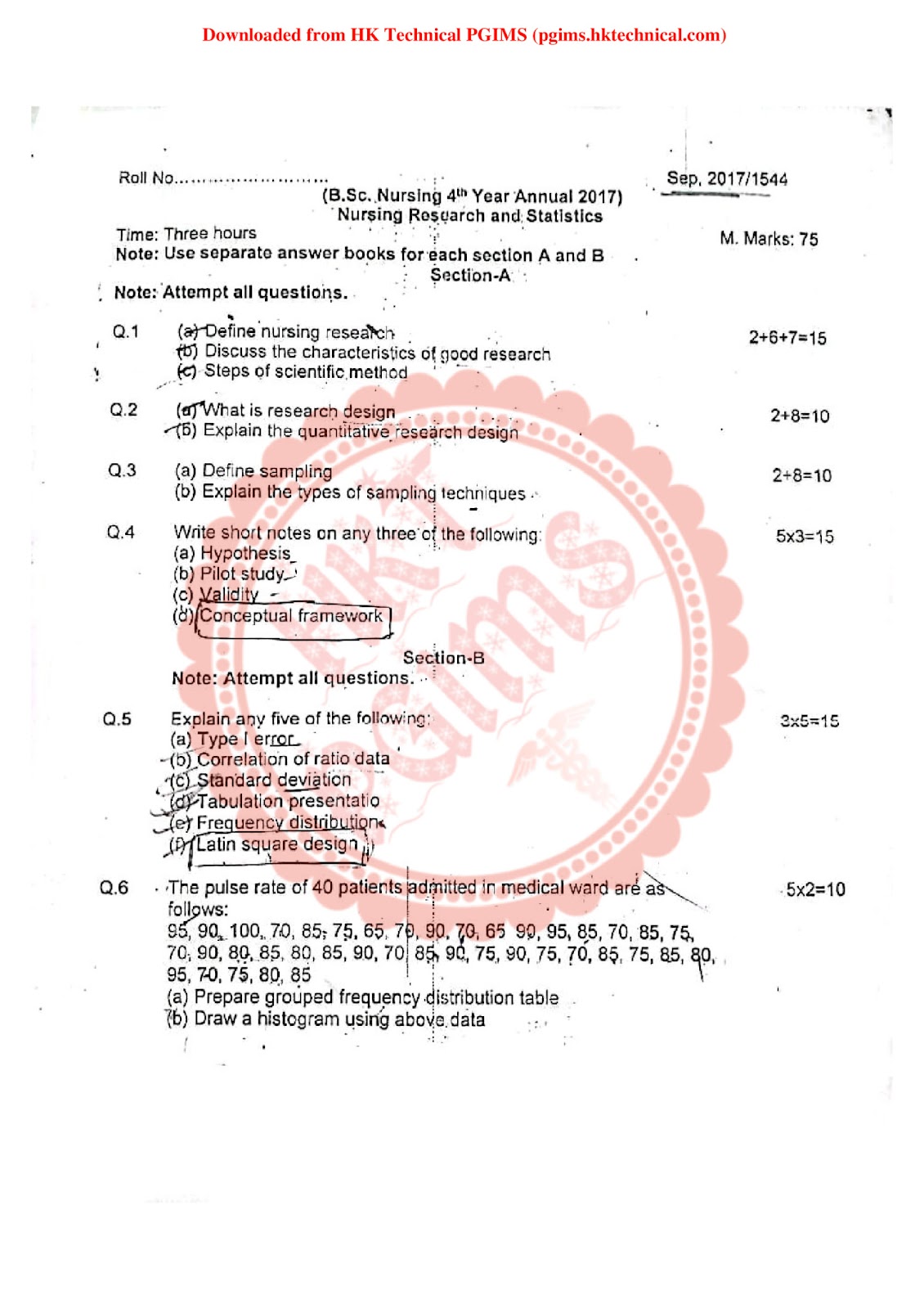 Nursing Research and Statistics Download Question Paper PDF BSc Nursing 3rd Semester 2017