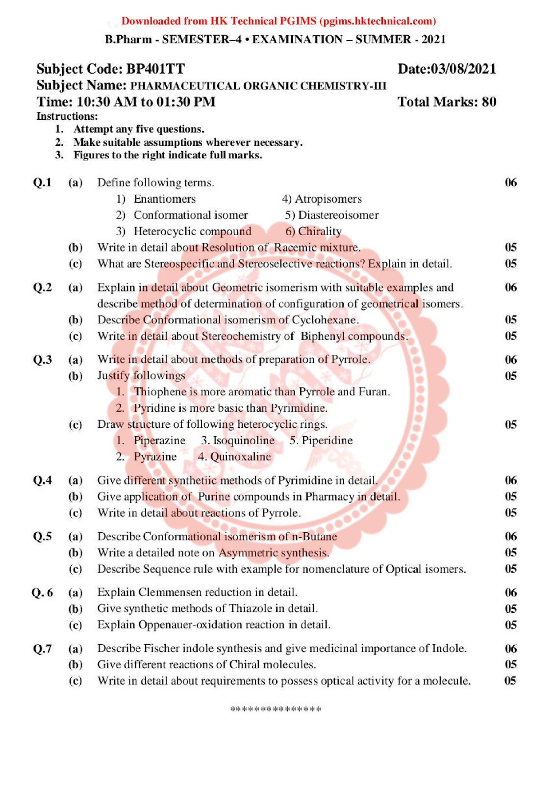 Pharmaceutical Organic Chemistry III GTU last 3 years Download Question Paper PDF BPharmacy 4th Semester 2021