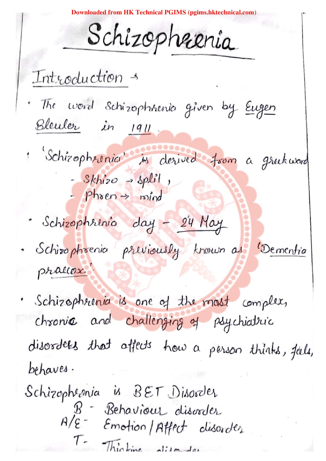 Schizophrenia Handwritten Download Notes PDF BSc Nursing 3rd Year 2021