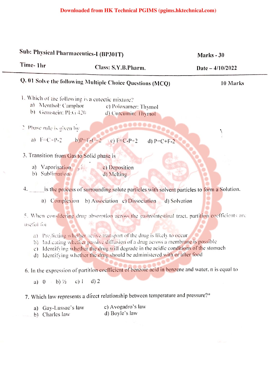 S.Y.B.Pharm 1st sessional physical pharmaceutics1 Q.P. S.P.B.C. COP Download Question Paper PDF BPharmacy 3rd Semester 2022