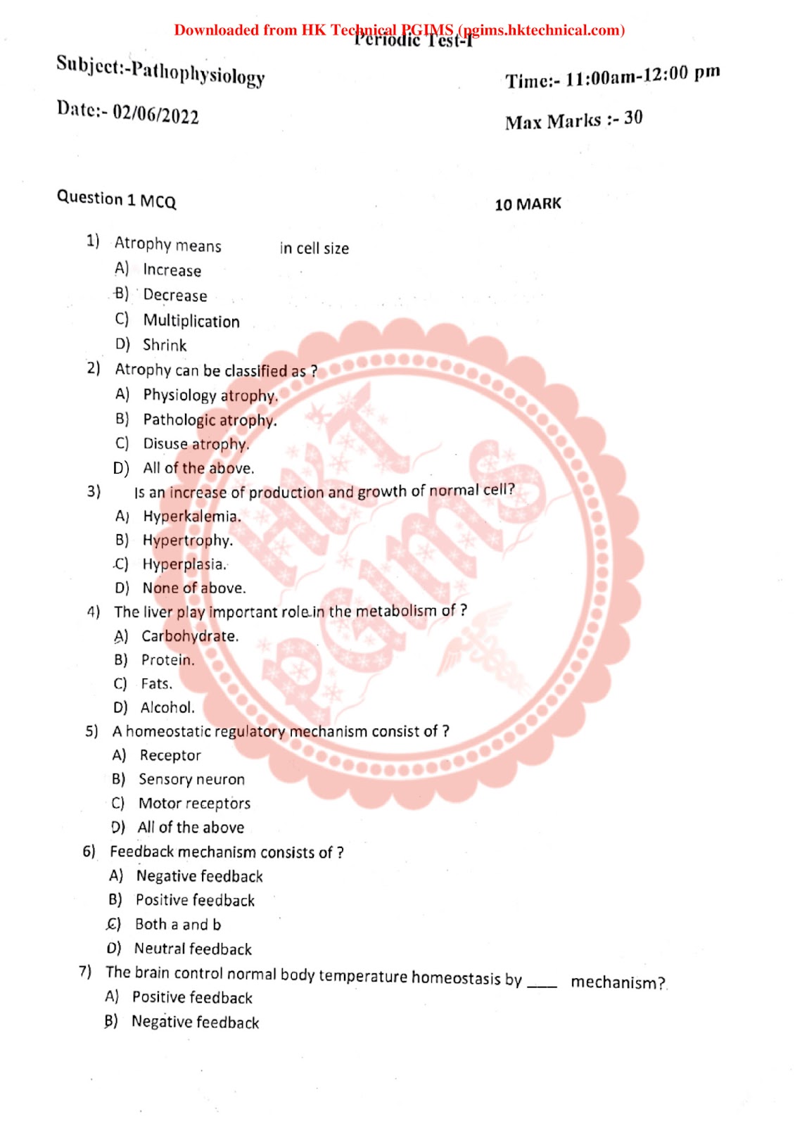 1st sessional Pathophysiology 2nd semester S.P.B.C.COP Download Question Paper PDF BPharmacy 2nd Semester 2022