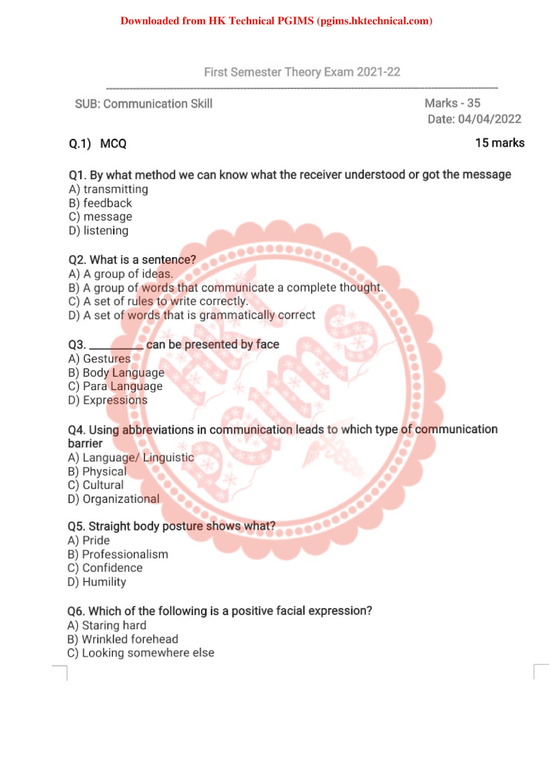 Communication Skill Sessional Download Question Paper PDF BPharmacy 1st Semester 2022