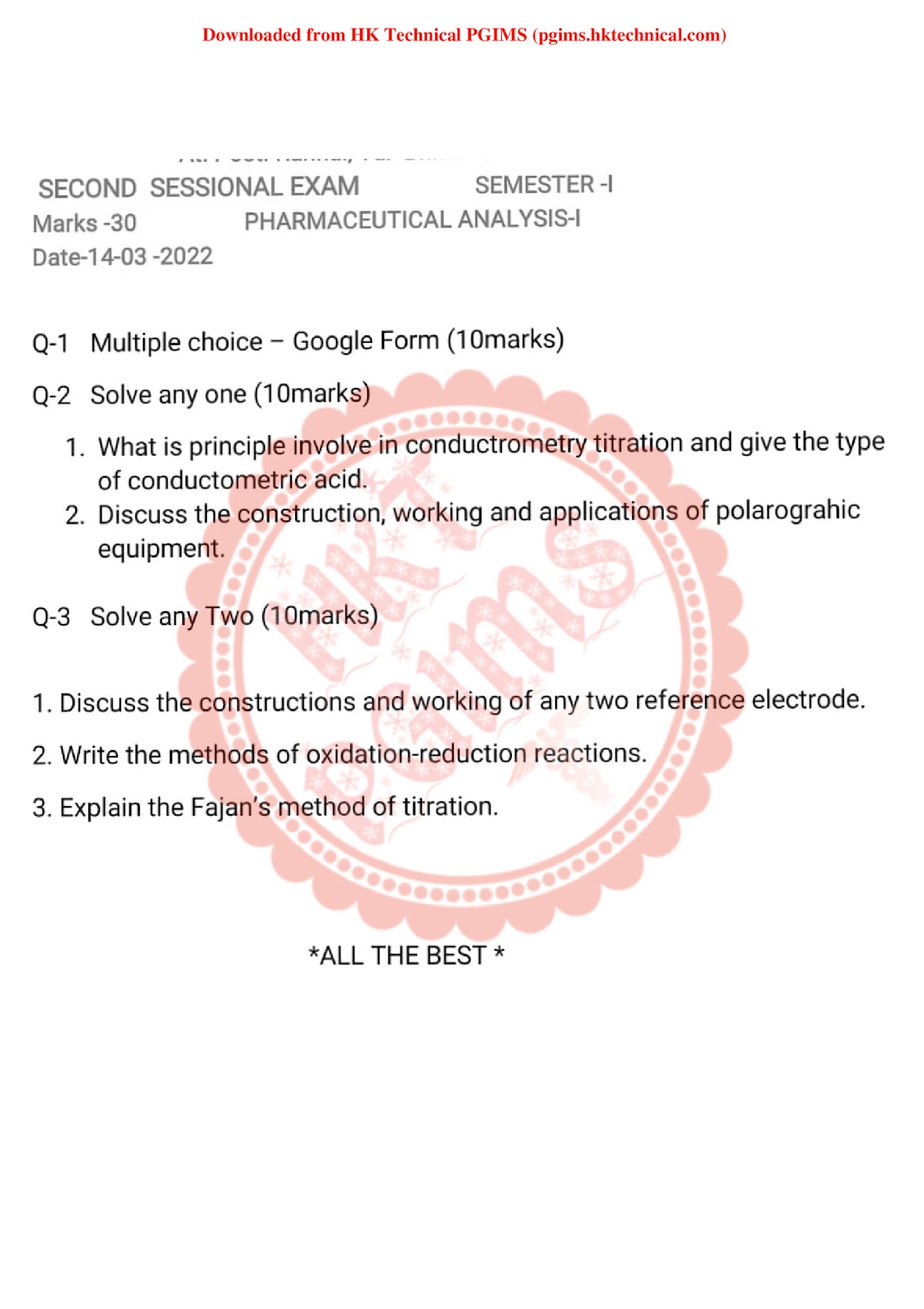 Pharmaceutical Analysis 2nd sessional Download Question Paper PDF BPharmacy 1st Semester 2022