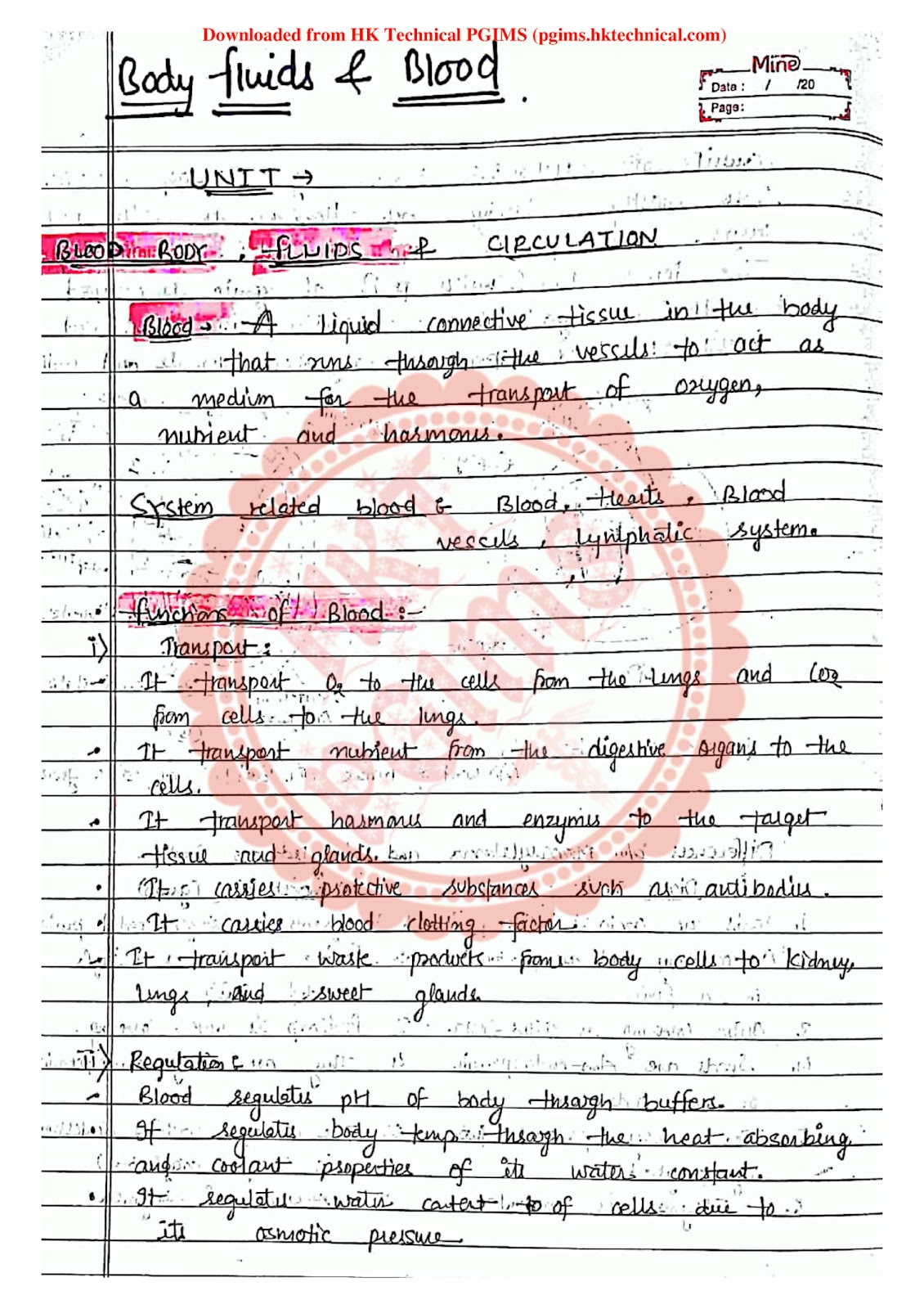 Body Fluid Blood and Lymphatic System Handwritten Download Notes PDF BPharmacy 1st Semester 2023
