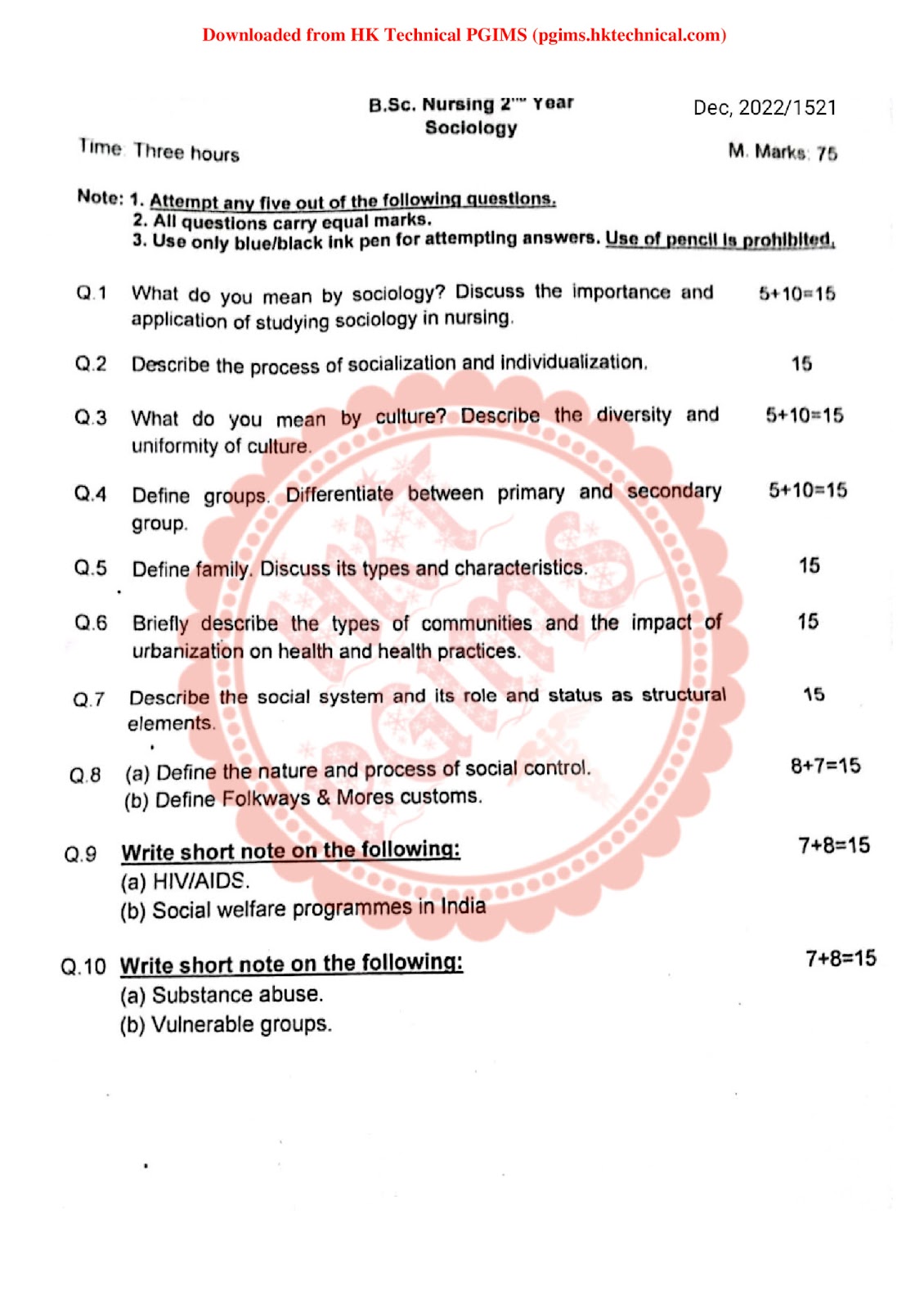 Sociology Download Question Paper PDF BSc Nursing 2nd Year 2022