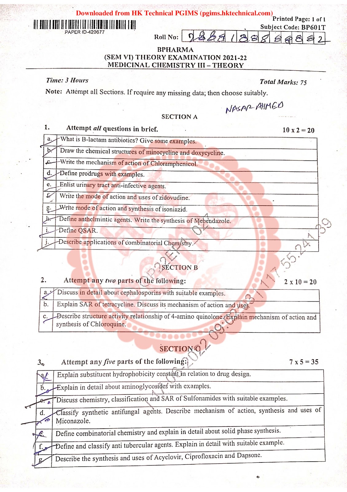 BP601T Medicinal Chemistry-III AKTU Download Question Paper PDF BPharmacy 6th Semester 2022