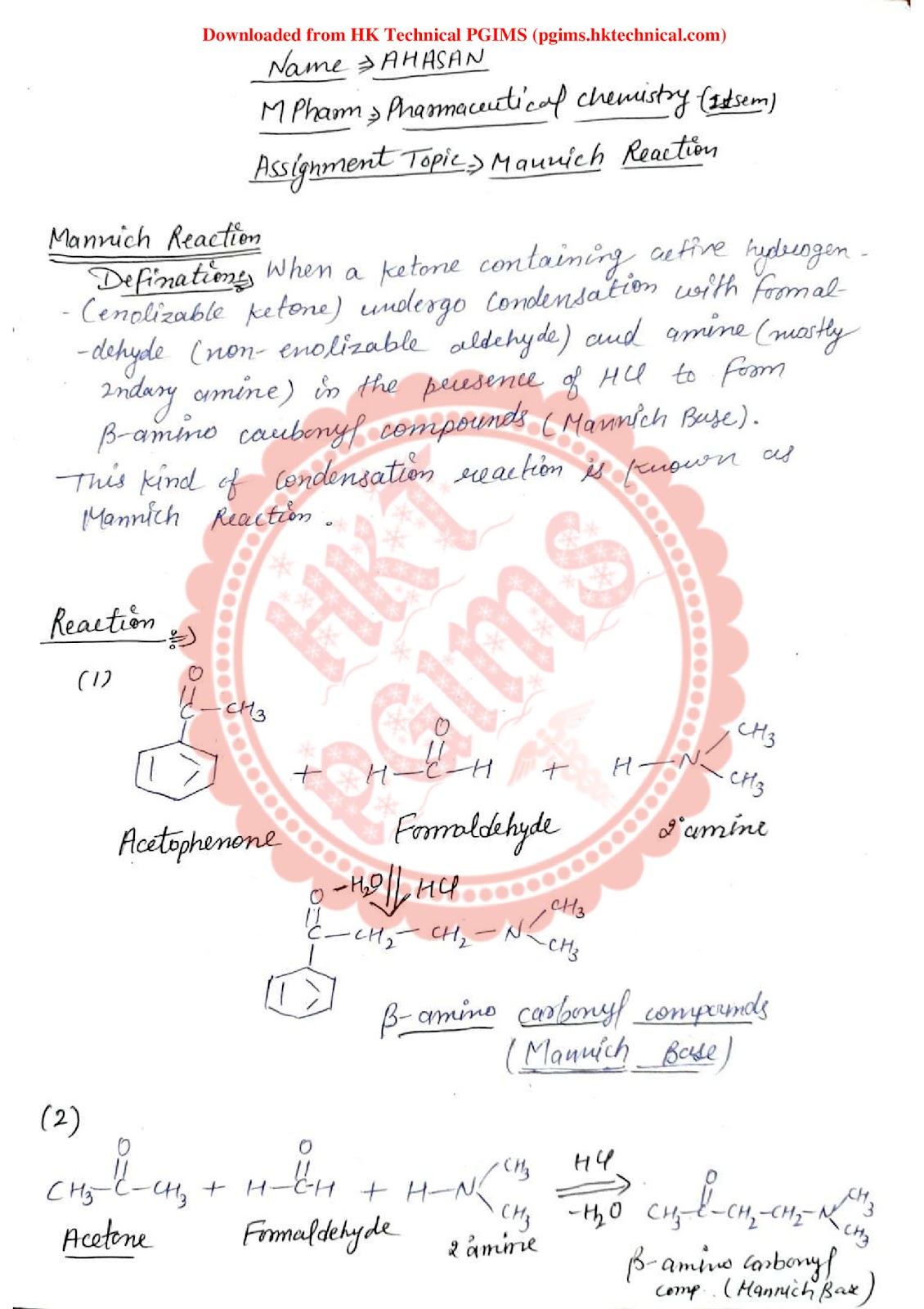 Mannich Reaction Download Notes PDF MPharmacy 1st Semester 2022