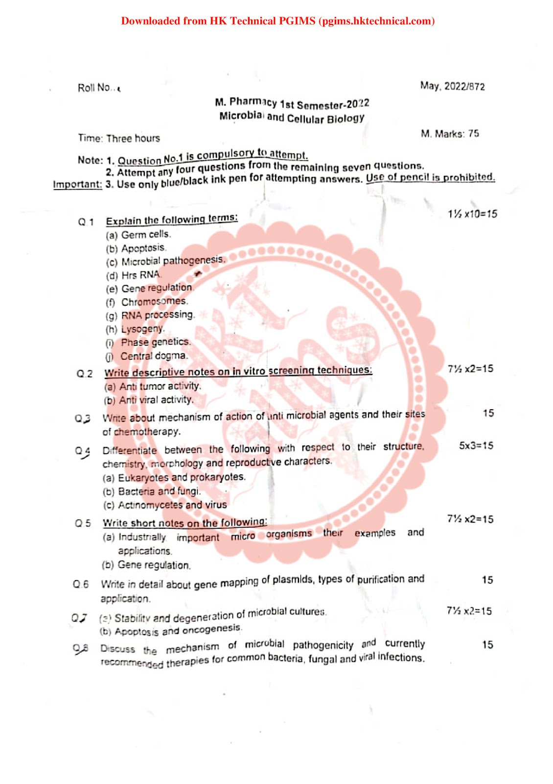 Microbial and cellular biology Download Question Paper PDF MPharmacy 1st Semester 2022