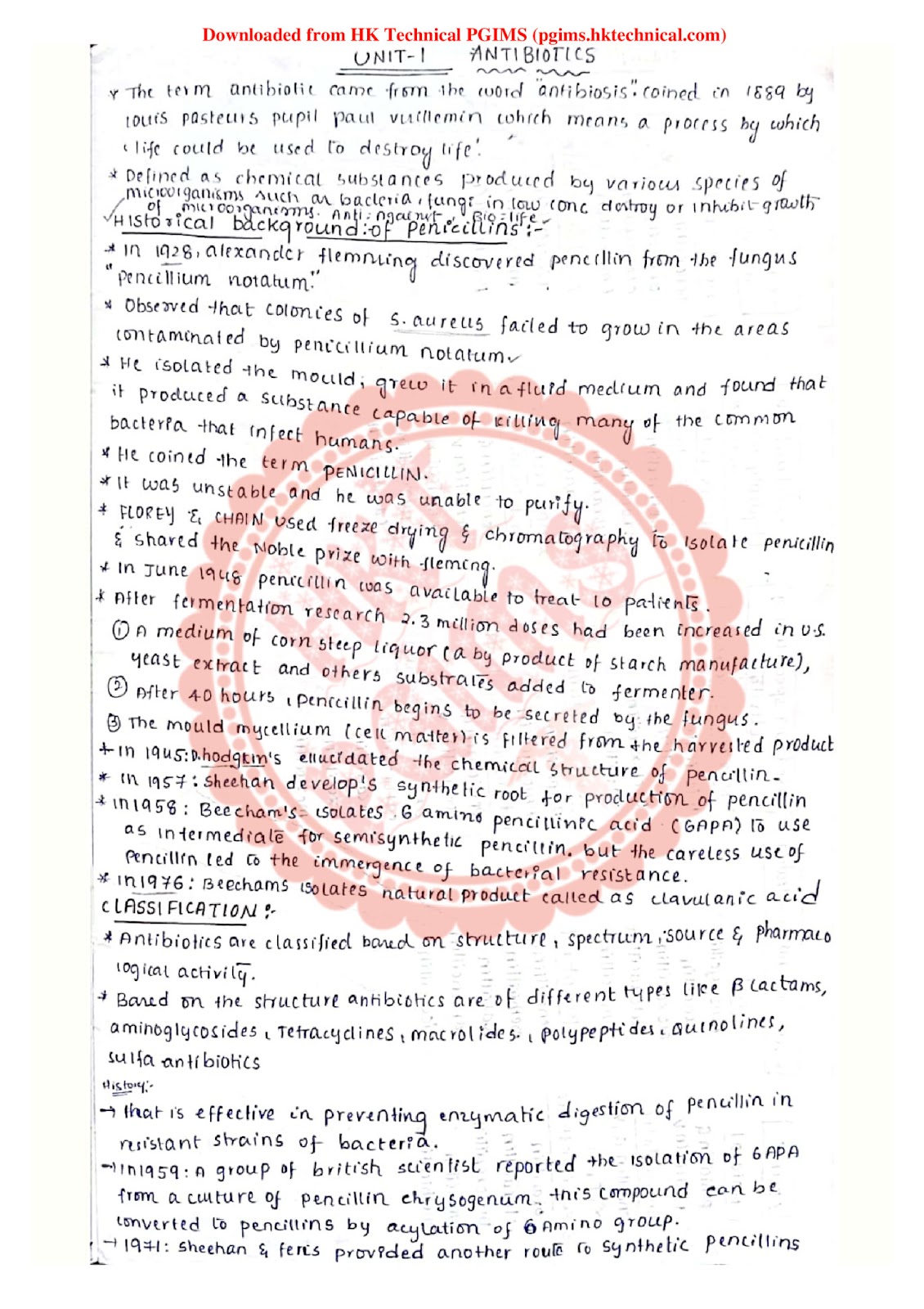 Unit -1 Antibiotics Medicinal Chemistry -III Handwritten Download Notes PDF BPharmacy 6th Semester 2022