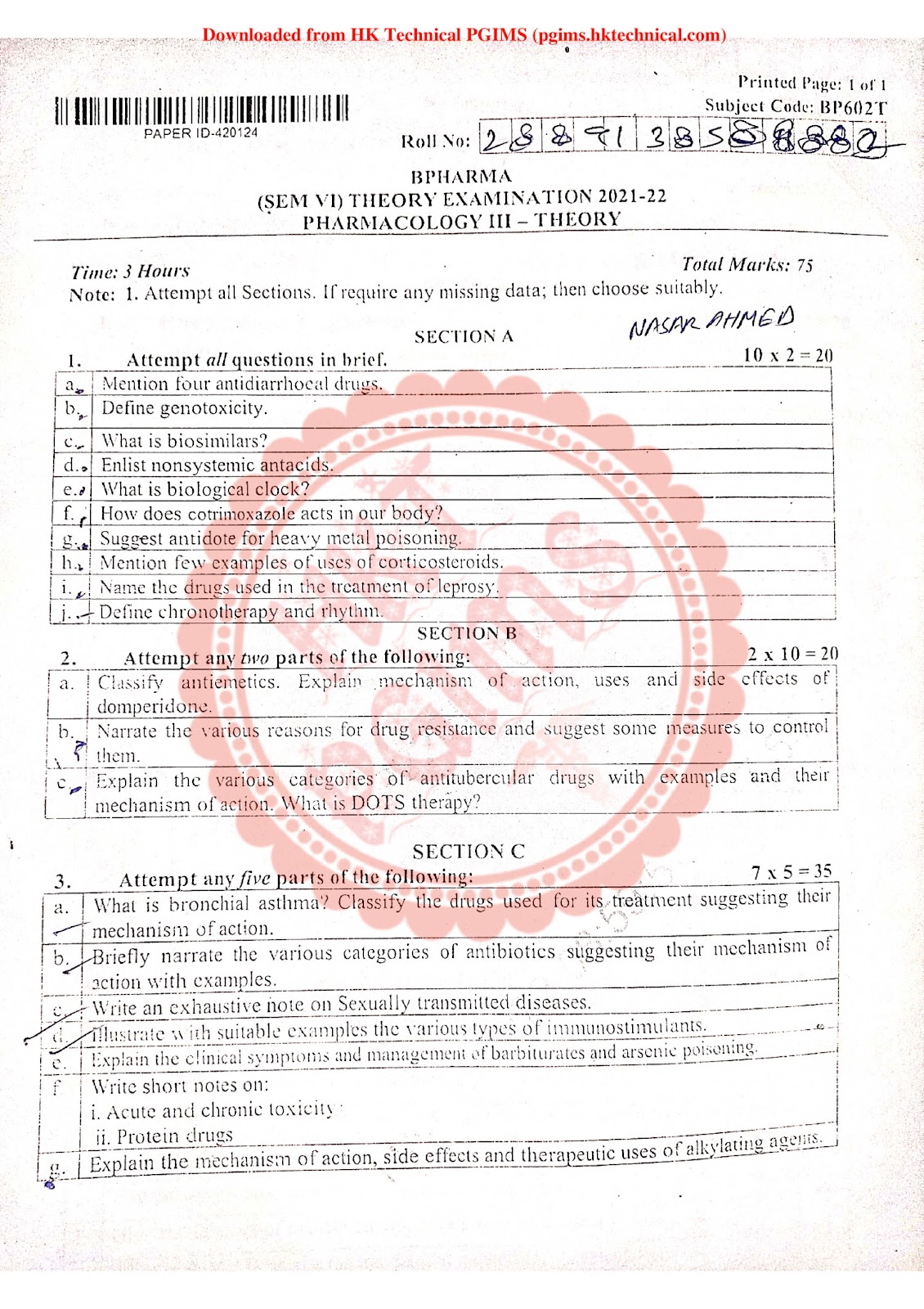 Pharmacology III BP602T AKTU Download Question Paper PDF BPharmacy 6th Semester 2022